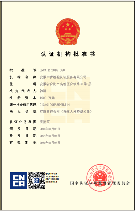 安徽中青檢驗(yàn)認(rèn)證服務(wù)有限公司成立于2017年6月6日,2018年1月3日通過國家認(rèn)證認(rèn)可監(jiān)督管理委員會批準(zhǔn),現(xiàn)認(rèn)證領(lǐng)域:質(zhì)量管理體系、環(huán)境管理體系、職業(yè)健康安全管理體系、食品安全管理體系、HACCP管理體系、有機(jī)產(chǎn)品認(rèn)證、良好農(nóng)業(yè)規(guī)范、服務(wù)體系、醫(yī)療器械質(zhì)量管理體系、企業(yè)誠信管理體系、食品工業(yè)企業(yè)誠信管理體系、食安安徽品牌等類別認(rèn)證。